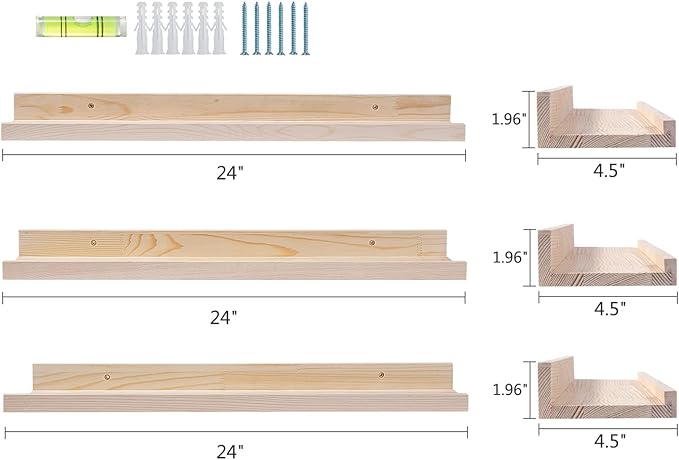 - Wall Mounted Floating Shelves Size: 24 inch x 4.5 inch x 1.8 inch (L x W x H), a set of 3 natural wooden floating shelves. Wall ledge shelves are sturdy enough to hold your favorite collections, family photos, kidsβ books, decorative items, cosmetics or green plants.