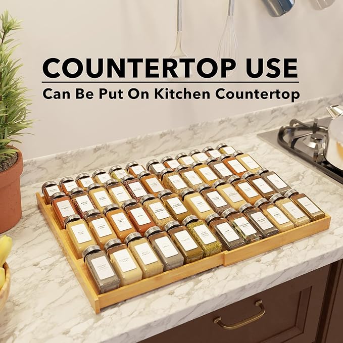 - STURDY CONSTRUCTION - The drawer spice rack is made of durable solid bamboo; Live an organized and sustainable life with this bamboo seasoning drawer organizer