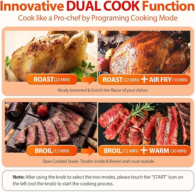 - 【Fast & Even cooking, Less-oil, Crispy】The convection fan of air fryer generate 360°hot airflow produces crispier exterior and moist tender interior with less oil,providing you with perfect taste and healthy diet. The innovative dual cook function enables you to combine any two functions in preset. Make Complex recipes effortless and rich the dish's flavor.Double Glass door heat insulation reduces heat loss effectively reduces preheat time.