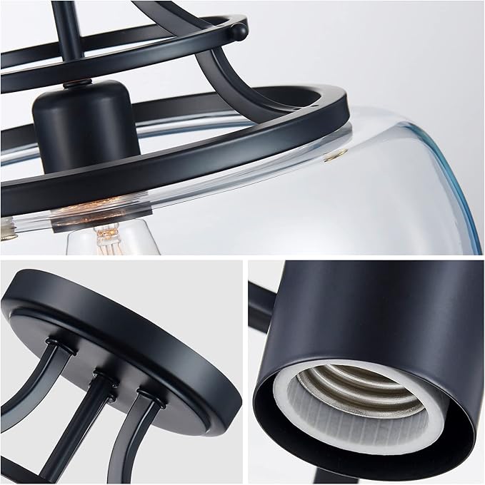 WUZUPS Chandelier Rustic Farmhouse Industrial Round Semi-flushmount Ceiling LED Light Fixture with Clear Glass Shades for Bathroom Kitchen Foyer Entryway, H 11.8" x W 13.4", E26 Base, Black