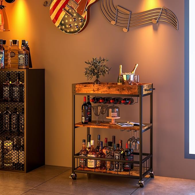 Bar Cart Serving Wine 3 Tier Home Rolling Rack with Wheels Mobile Kitchen Industrial Vintage Style Wood Metal Serving Trolley Serving Cart,Glass Holder Bar Cabinet