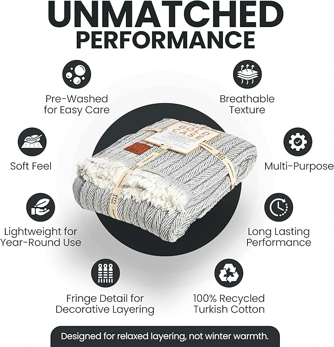 Gold Case Throw Blanket for Couch – 100% Recycled Turkish Cotton Blankets & Throws – Elegant Decorative Throw Blankets for Living Room Sofa – Woven Throws for Couch – Vintage Grey – 50x60