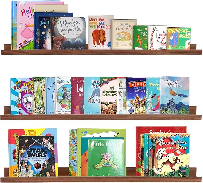 AZSKY 36 Inch Floating Book Shelves Rustic Wood Wall Picture Ledge Shelf for Storage Light Walnut Wall Mounted Picture Photo Display Shelf a Set of 3 Hanging Book Shelf