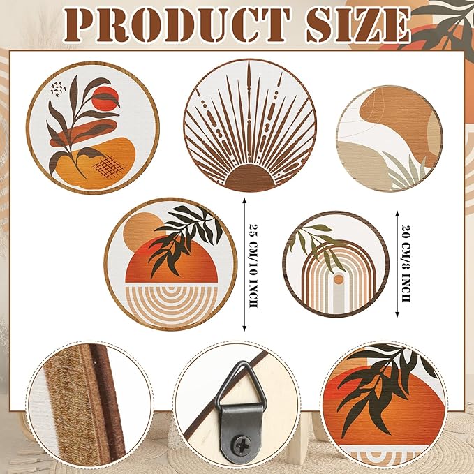 - Proper Size for Display: there are 2 kinds of sizes of the aesthetic wall art, 3 bigger ones measure about 10 inches/ 25 cm in diameter, and 2 smaller ones are about 8 inches/ 20 cm in diameter, all of them are about 0.2 inch/ 0.5 cm in thickness, proper size to catch people's attention
