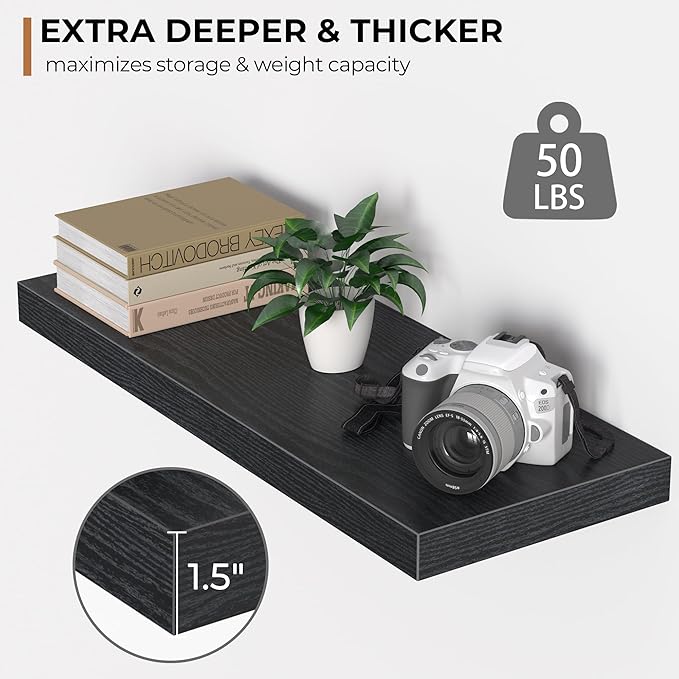 - Extra Deeper & Thicker - Each board measures 24"W x 9"D x 1.6"H. Extra deeper and thicker design in order to bring maximizes storage space and weight capacity, even hold up to 50 lb each. This floating shelf taking up zero square feet, reduces clutter and highlights dΓ©cor in compact spaces.