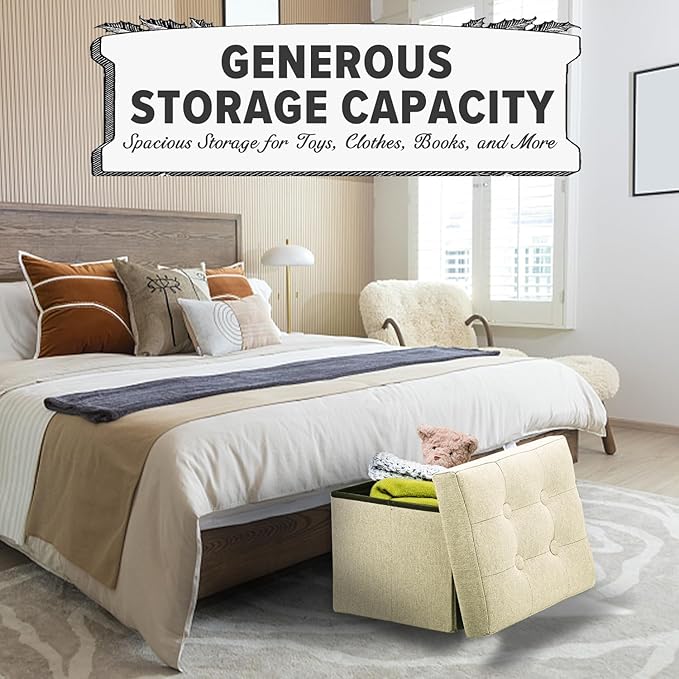 - DECORATIVE MULTI-PURPOSE LINEN OTTOMAN – Our linen fabric storage ottoman are a stylish, practical alternative to other boring storage solutions. Not only will our ottoman help you get organized, the pure design, sophisticated shape, and neutral colors will complement any decor in any room for all your storage needs. Use them in the playroom, bedroom, living room, & more