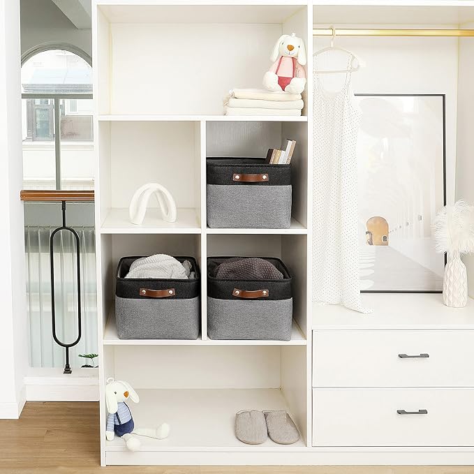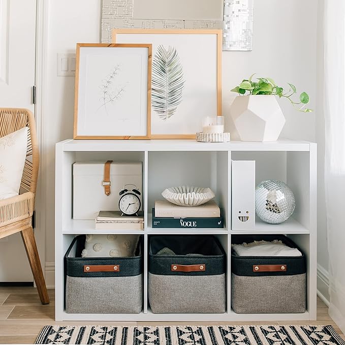 - Decorative Fabric and Vegan Leather – These versatile storage baskets for organizing your everyday life are made with a thick, high-quality fabric and fitted with leather handles to add a stylish touch to a living room, bedroom, office, or personal space.