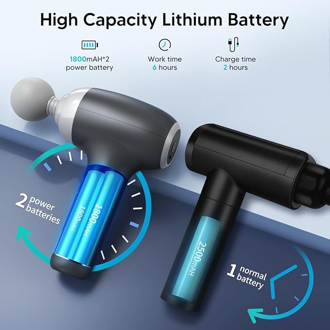 - HIGH-CAPACITY LITHIUM BATTERY: Powered by 2 * 1800mAh batteries, the high-quality rechargeable battery gives this electric massage gun longer battery life; The Travel Massage Gun can continuously run for 8 hours and takes 3 hours to fully charge through the USB cable. Its exact working time depends on vibration frequency and massage pressure during massage.