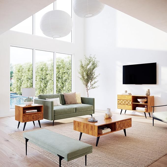Bme Georgina Solid Wood Nightstand With 1 Drawer & Open Shelf- Fully Assembled Mid Century Modern Side Table - Geometric Pattern Bedside Dresser for Bedroom and Living Room