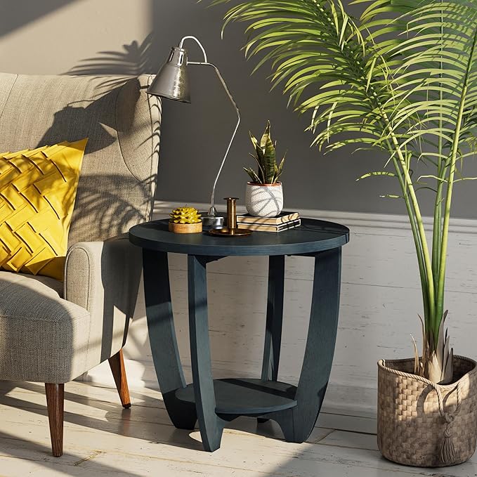 Rustic Farmhouse End Table with Storage Shelf, French Country Accent Side for Family, Dinning or Living Room, Small Spaces, Modern, Round, Vintage Blue Finish, Curved Leg