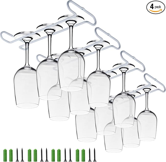 White 4 Wine Glass Rack Under Cabinet Shelf 10 Inch Stemware Storage Hanging Hanger Organizer Glasses Holder with Drying Under Counter Metal for Kitchen and Bar