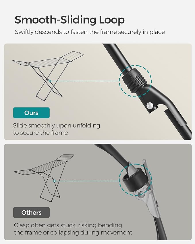 - [Thoughtful Details] This drying rack features a smooth-sliding loop, a plastic clip that keeps wings securely in place when folded, and floor-friendly plastic feet