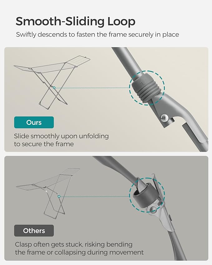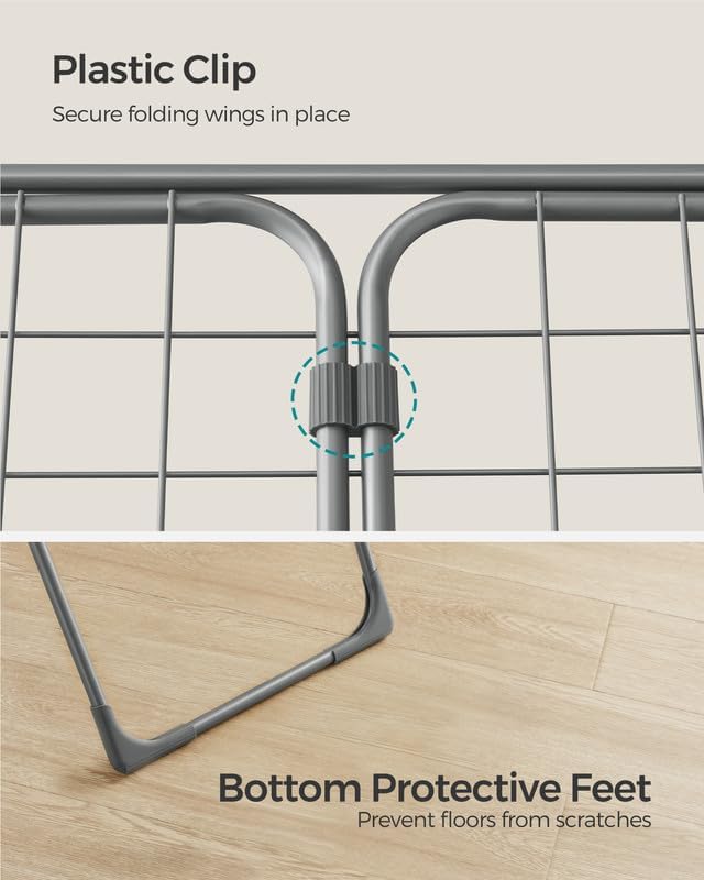 - [Thoughtful Details] This drying rack features a smooth-sliding loop, a plastic clip that keeps wings securely in place when folded, and floor-friendly plastic feet