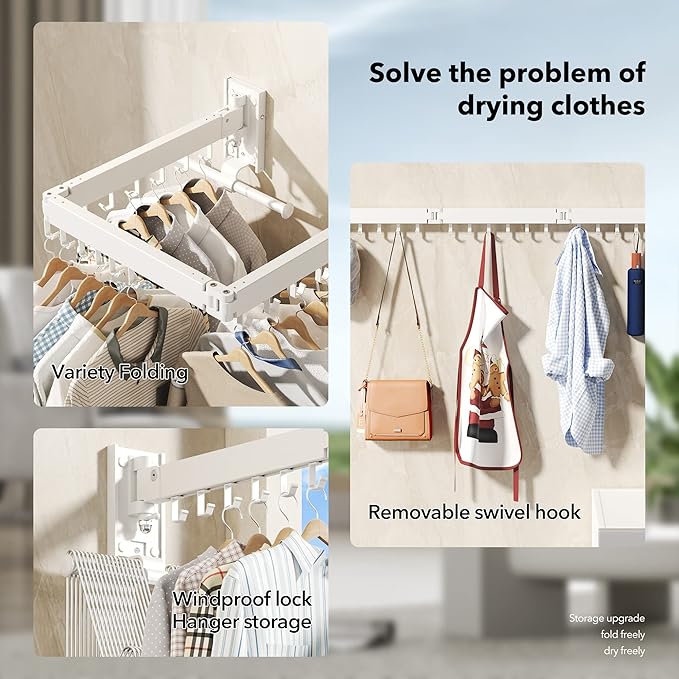 Wall Mounted Clothes Hanger Rack, Clothes Drying Rack,Laundry Drying Rack,Collapsible Clothes Rack Wall Mount, Retractable Drying Rack Clothing,can Fold Upward & Left & Right,White Color
