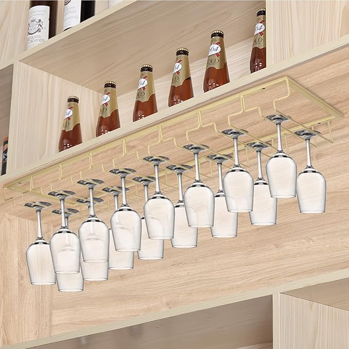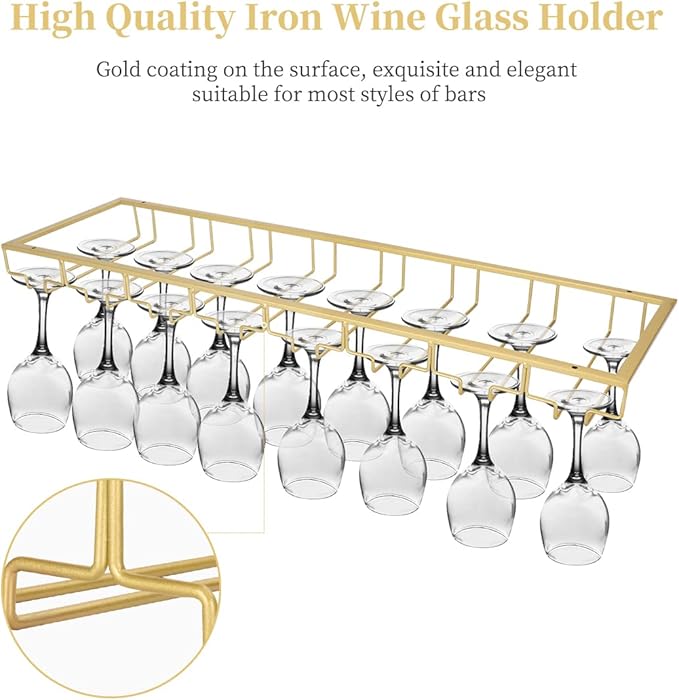 Xverycan Wine Glass Rack Under Cabinet, 8 Row Extreme Large Stemware Hanger, Metal Wine Goblet Holder, DIY Bar Glass Storage Rack for Bar Counter, Kitchen, Screws Included (Gold)