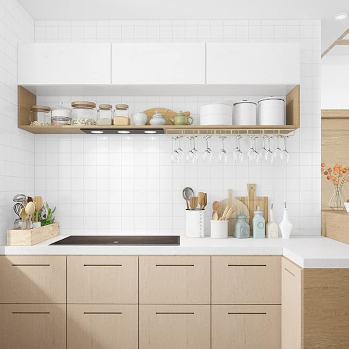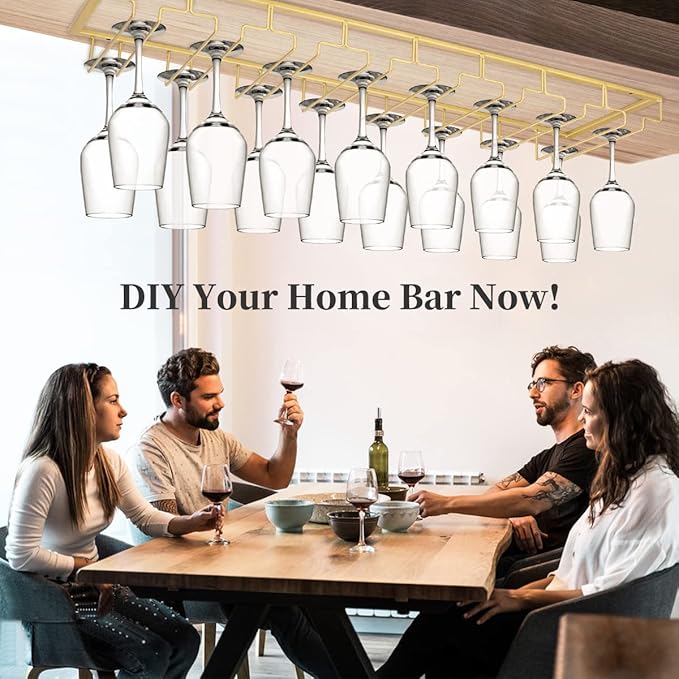 - [Easy to install] - This wine glass hanging rack comes with pre-drilled mounting holes and the screws needed. This rack just takes you a few minutes to assemble and it is easy .What you need to do is using a screwdriver to tighten the screws into the bottom of the wooden cabinet. Ideal for DIY making a wine bar at home or kitchen.