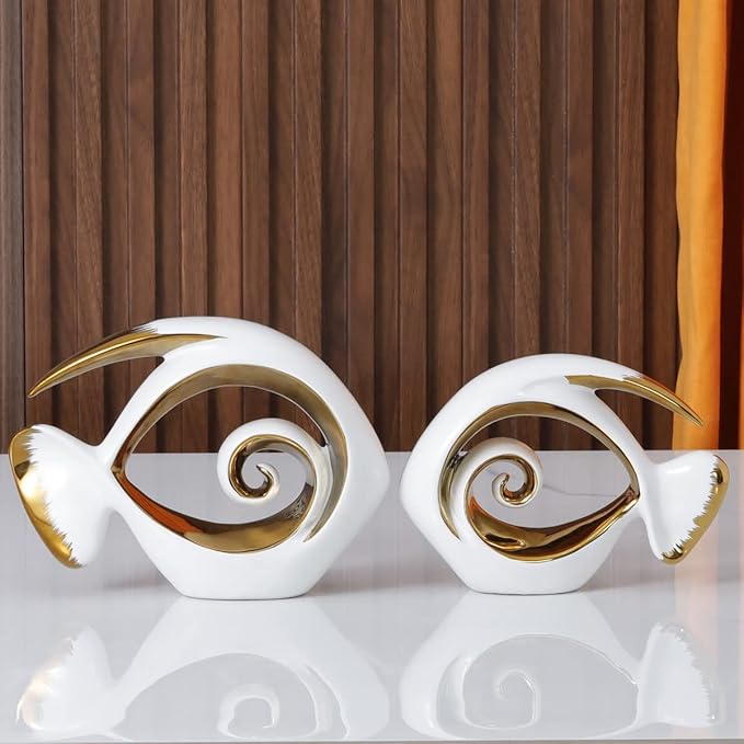 White Gold Ceramic Fish Figurines - Coastal Home Decor, Modern Ocean Centerpieces for Living Room, Dining Area, Bathroom, Office, Coffee Table, Beach House, Nautical, Seaside, Entrance, Shelf Display