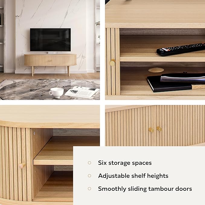 - BRING CHARACTER TO YOUR HOME by using an oak modern tv stand which curvy corners and smoothly sliding tambour doors makes it a perfect accent cabinet. Aesthetic appeal makes it suitable for both living room tv stand and bedroom tv table. You will receive 2 sets of door knobs - wood & messing.