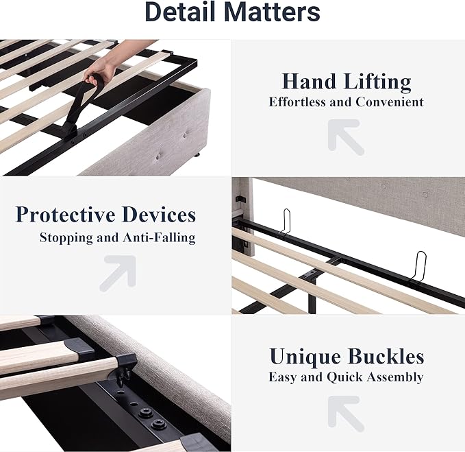 - Space-Saving Storage: With its lifting up storage feature, this bed frame provides ample space to store extra bedding, clothing, shoes, and other items, especially helpful for smaller bedrooms or apartments where storage space is limited