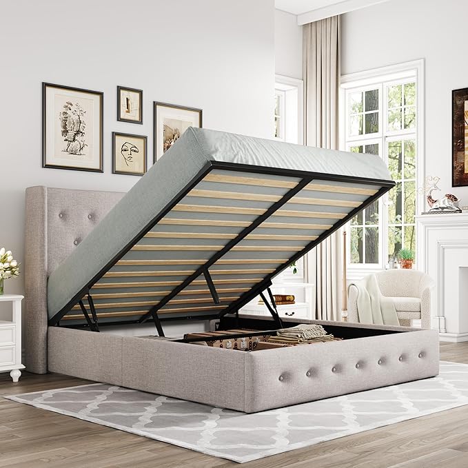 Allewie Full Size Lift Up Storage Bed, Button Tufted Headboard with Wingback, Hydraulic Support, No Box Spring Needed, Light Beige