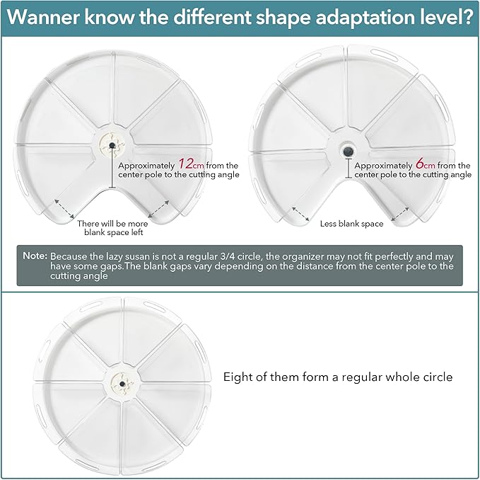 - SUITABLE SIZE:The 1/8 wedge-shaped condiment container can fit different size of food while neatly organized them in places. It comes in a set of 8 pieces and is most suitable for 26"- 27” diameter corner cabinet