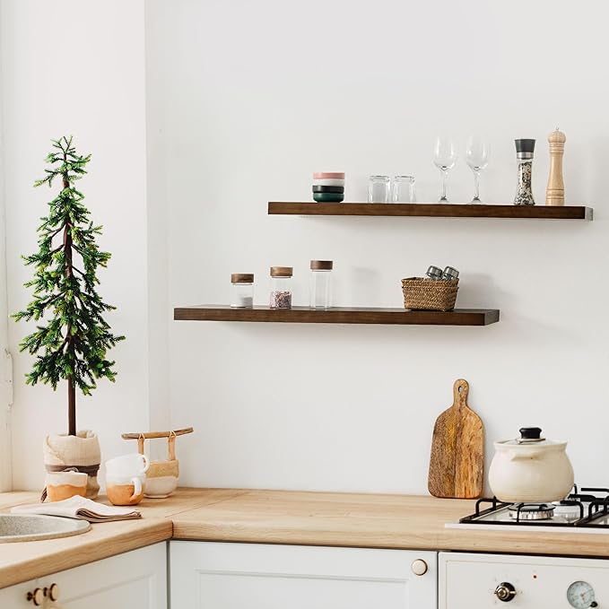 - Extra Deeper & Thicker for Storage - Each board measures 36"W x 8"D x 1.4"H. Extra deeper and thicker design in order to bring maximizes storage space and weight capacity, even hold up to 60 lb. This floating shelf taking up zero square feet, reduces clutter and highlights dΓ©cor in compact spaces. It can help make full use of the empty wall, making it much more space-saving and making your room look larger and tidier.
