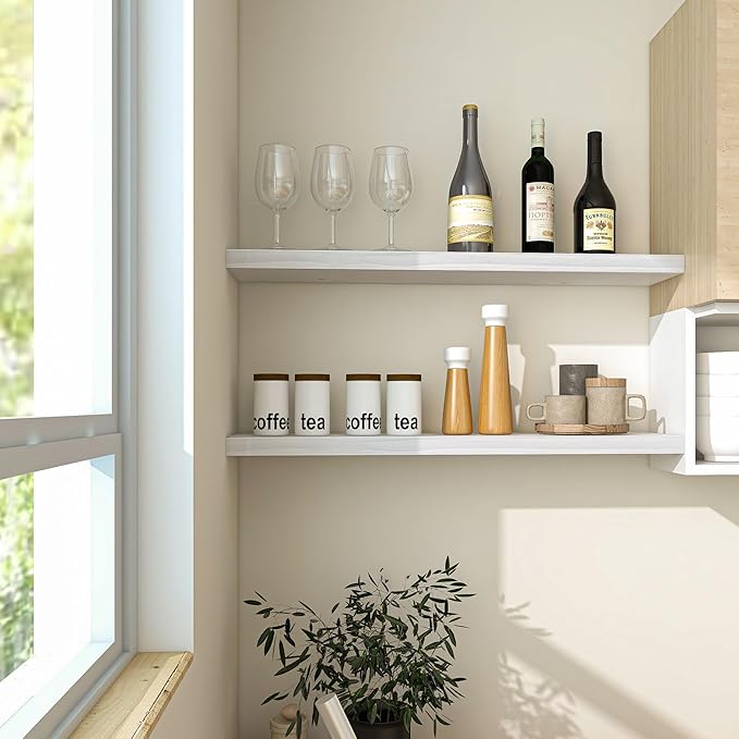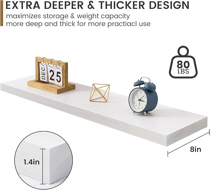 - Extra Deeper & Thicker for Storage - Each board measures 36"W x 8"D x 1.4"H. Extra deeper and thicker design in order to bring maximizes storage space and weight capacity, even hold up to 60 lb. This floating shelf taking up zero square feet, reduces clutter and highlights dΓ©cor in compact spaces. It can help make full use of the empty wall, making it much more space-saving and making your room look larger and tidier.