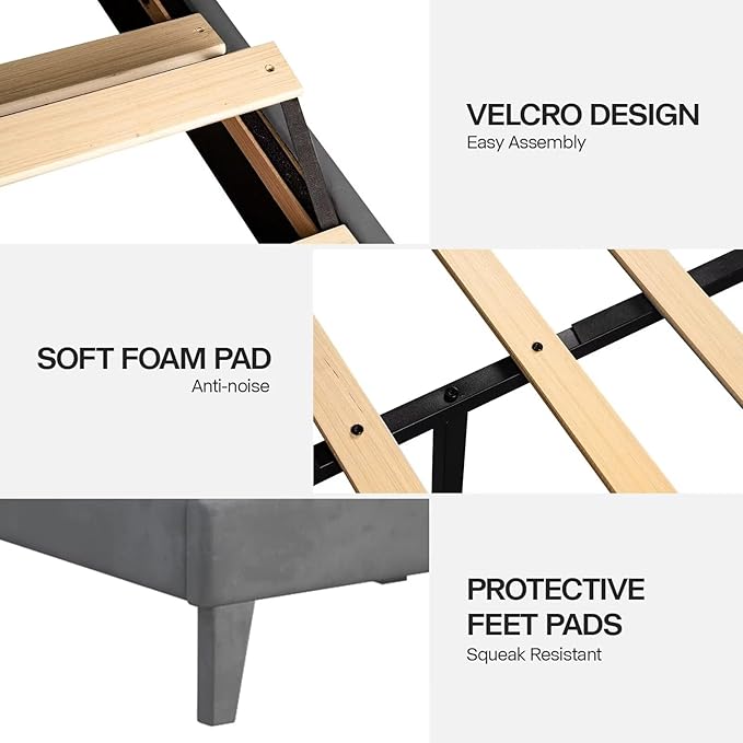 - NO BOX SPRING REQUIRED & NICE SERVICE: The mattress can be placed directly on the wooded slats of the grey bed frame, no need to buy additional box springs, you can save more money and time! DOGIBIXO bed frame warranty: ①Replace any missing or damaged parts. ② Reasonable compensation for quality and transportation problems. ③ 24-hour after-sales customer service is online to solve your problems and bring you a good shopping experience.