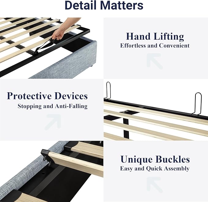 - Space-Saving Storage: With its lifting up storage feature, this bed frame provides ample space to store extra bedding, clothing, shoes, and other items, especially helpful for smaller bedrooms or apartments where storage space is limited