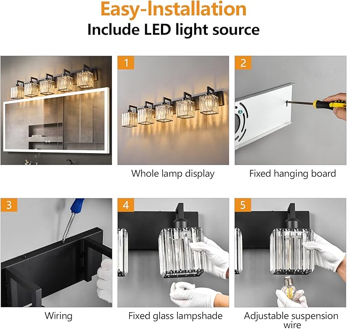 - 【Easy Installation】This is designed for US standard junction box, no complicated installation procedure is needed. All required parts are included in the package with additional replacement crystal strips. Note: For your safety, please install the vanity light under the guidance of an electrician.