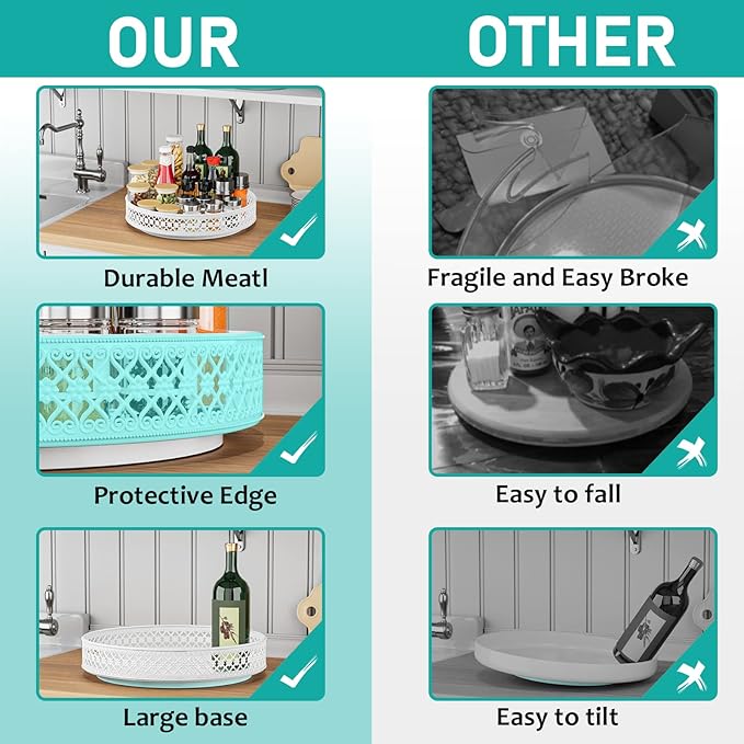 - Durable Metal Meterial: This heavy duty turntable organizer is made of quality anti-rust and waterproof metal.Much more stronger and durable than the plastic spinner organizer. Wear-resistant, abrasion-resistant coating can ensure long lasting usage and it's easy to clean .