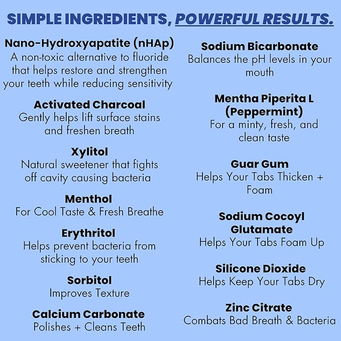 - MADE WITH 7% NANO-HYDROXYAPATITE (nHAp): All of our toothpaste tablets are formulated with a marvel in oral care known as Nano-Hydroxyapatite which is a non-toxic alternative to fluoride that helps restore and strengthen your teeth while reducing sensitivity. nHAp helps to remineralize your teeth, prevent decay, reduce sensitivity, and whiten!