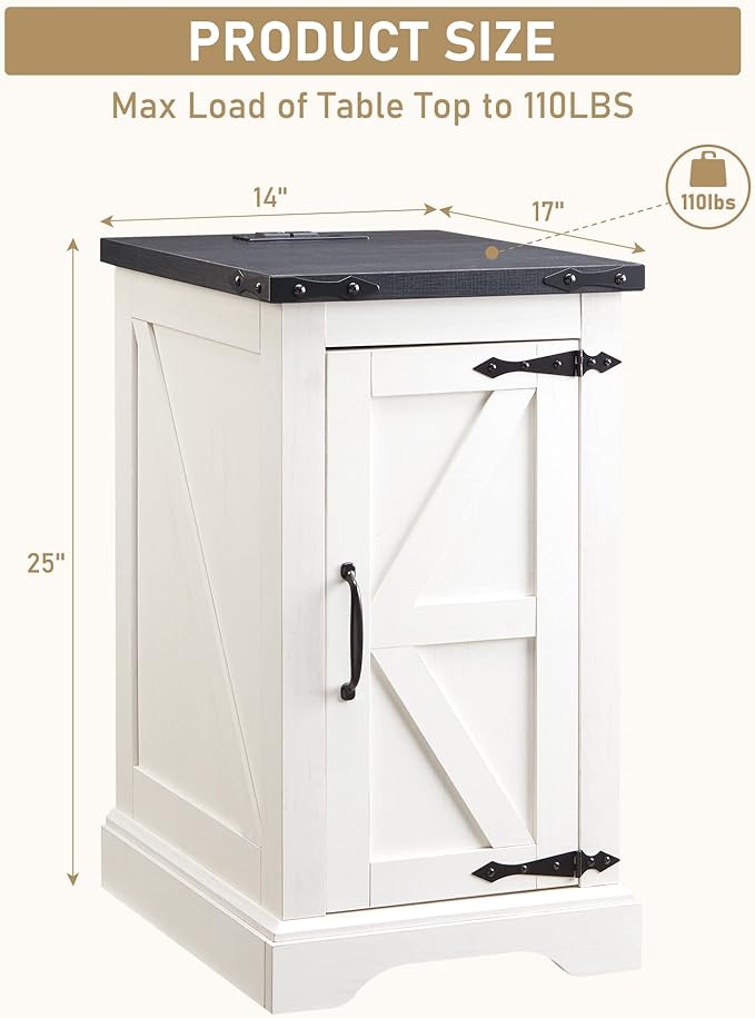 JXQTLINGMU Nightstand with Charging Station, Rectangular Farmhouse End Table with Barn Door and Adjustable Storage Shelf, 17" Deep Wood Rustic Sofa Side Table for Living Room, Bedroom, White