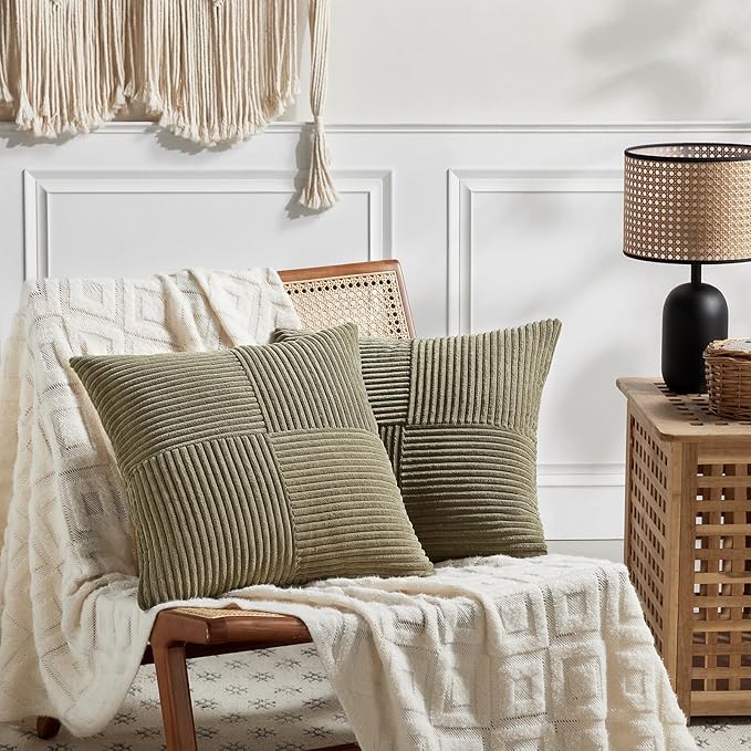 Fancy Homi 2 Packs Olive Green Decorative Throw Pillow Covers 22x22 Inch for Living Room Couch Bed Sofa, Rustic Farmhouse Boho Home Decor, Soft Corss Corduroy Patchwork Accent Cushion Case 55x55 cm