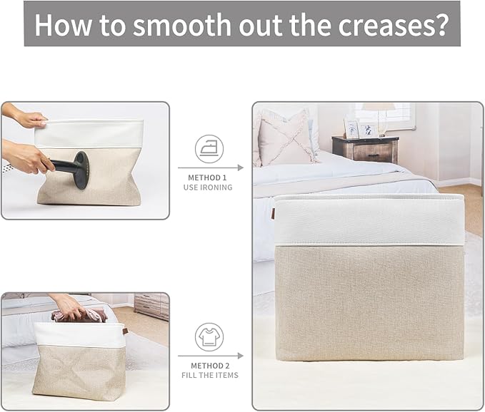 - 【Maintenance & Care Tip】 - Collapsible design for space saving. Our foldable baskets comes in a compression packing which may result in wrinkled storage bin during the long transit. Get rid of the wrinkles by either stuffing the fabric storage bins with blankets and pillows for a few days or steam iron them at low-heat setting. The organization baskets are easy to clean, you can dust the basket with a soft cloth with light soapy water when needed.