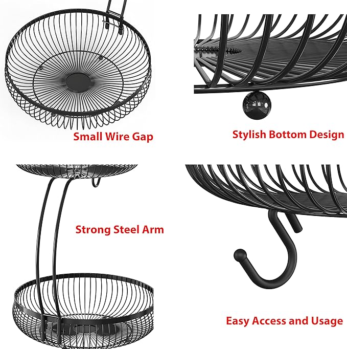 - 2 Tiers fruit bowl with banana hanger to hold various size of fruits, such as bananas, grapes, apples, organges and etc.