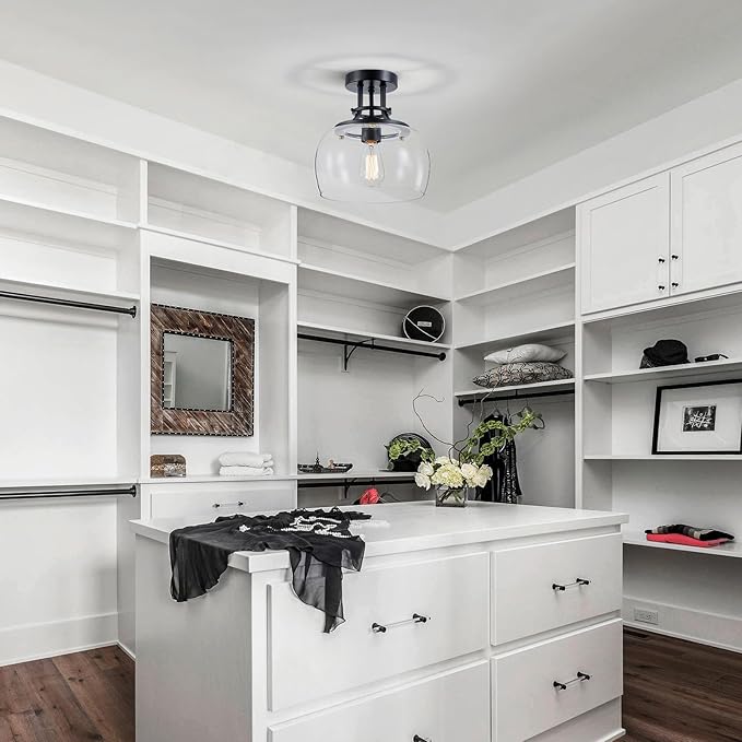 WUZUPS Chandelier Rustic Farmhouse Industrial Round Semi-flushmount Ceiling LED Light Fixture with Clear Glass Shades for Bathroom Kitchen Foyer Entryway, H 10" x W 10", E26 Base, Black