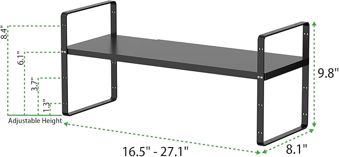 - Adjustable Shelves: This cabinet shelf organizer extends in length and adjusts in height to fit any space you need. The original shelf (collapsed) measures 16.5" L x 8.1" W x 9.8" H. The length can be extended from 16.5 inches to 27.1 inches. This expandable cabinet shelf provides four levels of board height adjustment. You can tailor each shelf with adjusting screws on both sides of the shelf frame