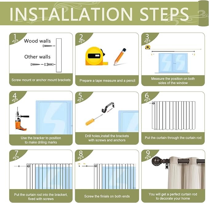 - Easy to Install Curtain Rods: TANGWIN provide detailed illustrated size instructions and modern decorative window curtains rod shipping package has detailed installation instructions inside, follow the steps, antique bronze curtain rods can easily complete the installation.
