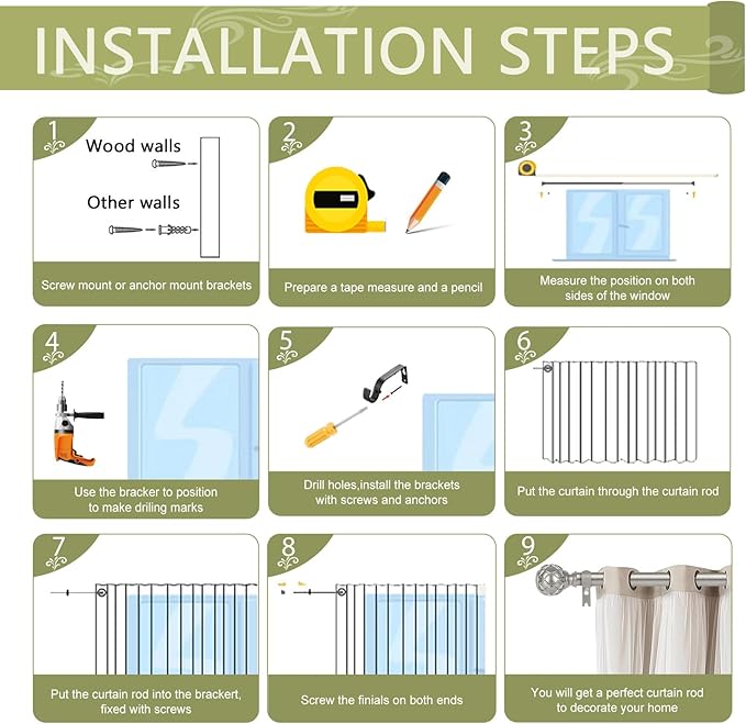 - Easy to Install Curtain Rods: TANGWIN provide detailed illustrated size instructions and modern decorative window curtains rod shipping package has detailed installation instructions inside, follow the steps, antique silver curtain rods can easily complete the installation.
