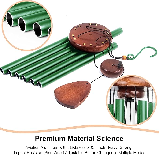 - 🎵[Large Wind Chimes Size]: The windchime is made of premium aluminum pipe and pine. The total length of the wind chimes from the top's S-shaped hook to the bottom's catcher is 37" Among them, 6 classic green anodized aluminum tubes have excellent corrosion resistance and wear resistance, and the length ranges from 8.7" to 12.6". The wood is made of wear-resistant and non-cracking pine