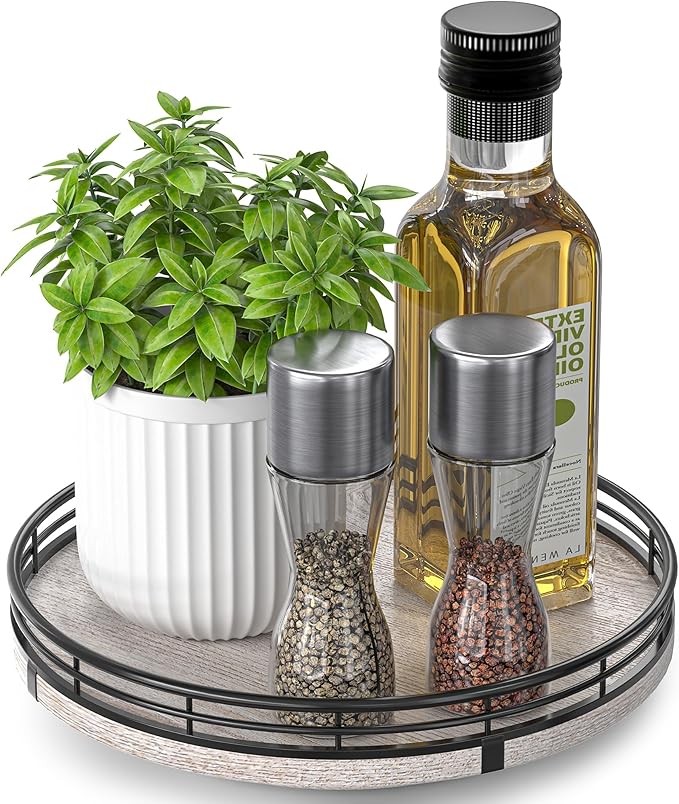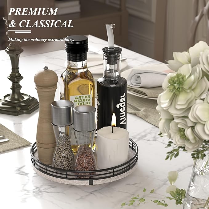 - 𝐔𝐏𝐃𝐀𝐓𝐄 𝐃𝐄𝐒𝐈𝐆𝐍: The base is large enough to hold a lot and heavy objects and successfully rotate. It is made of lovely oak wood that is strong with a sturdy metal rack to secure the items on the turntable. The turntable smoothly revolves all around making the items an easy reach. There is also included anti-slip pads on the bottom of the Lazy Susan, for extra surface protection.