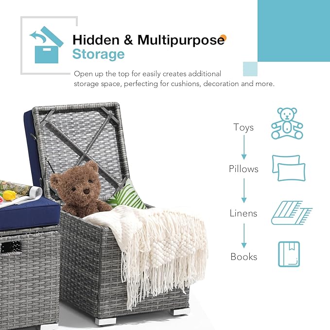 Patiorama 2 Piece Outdoor Patio Ottomans,All-Weather Grey PE Rattan Wicker Ottoman with Storage,Outdoor Footrest Footstool Seat w/Thick Cushion,Built-in Handle for Backyard Poolside Porch (Navy Blue)