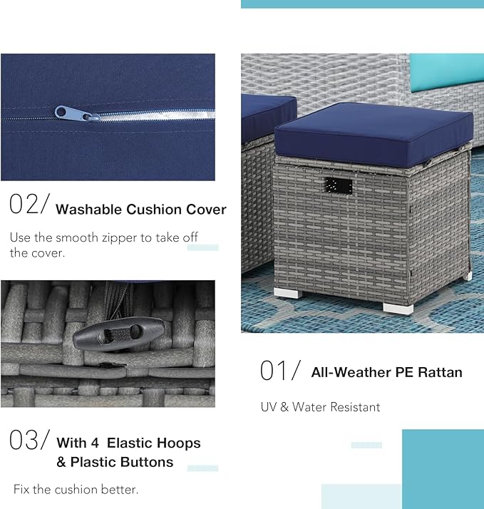 - [Multi-functional Ottomans]: The Patiorama 2-PC Outdoor Ottomans not only provide a perfect place for you to relax your feet but also can be used as additional seating for the rattan sofa set to meet your different needs. When the cushion is removed, the ottoman turns into a functional side table. They are suitable for patio, garden, backyard, poolside, living room, and more.