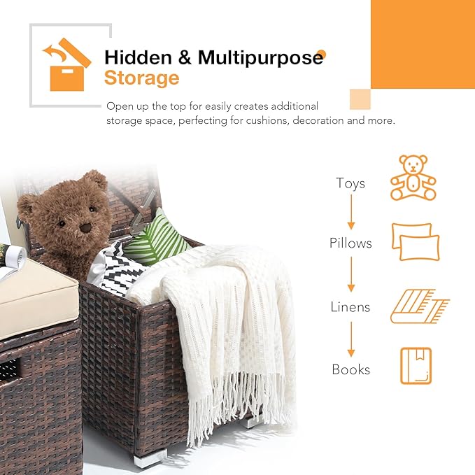 Patiorama 2 Piece Outdoor Patio Ottomans, All-Weather Brown PE Rattan Wicker Ottoman with Storage, Outdoor Footrest Footstool Seat w/Thick Cushion, Built-in Handle for Backyard Poolside Porch (Beige)