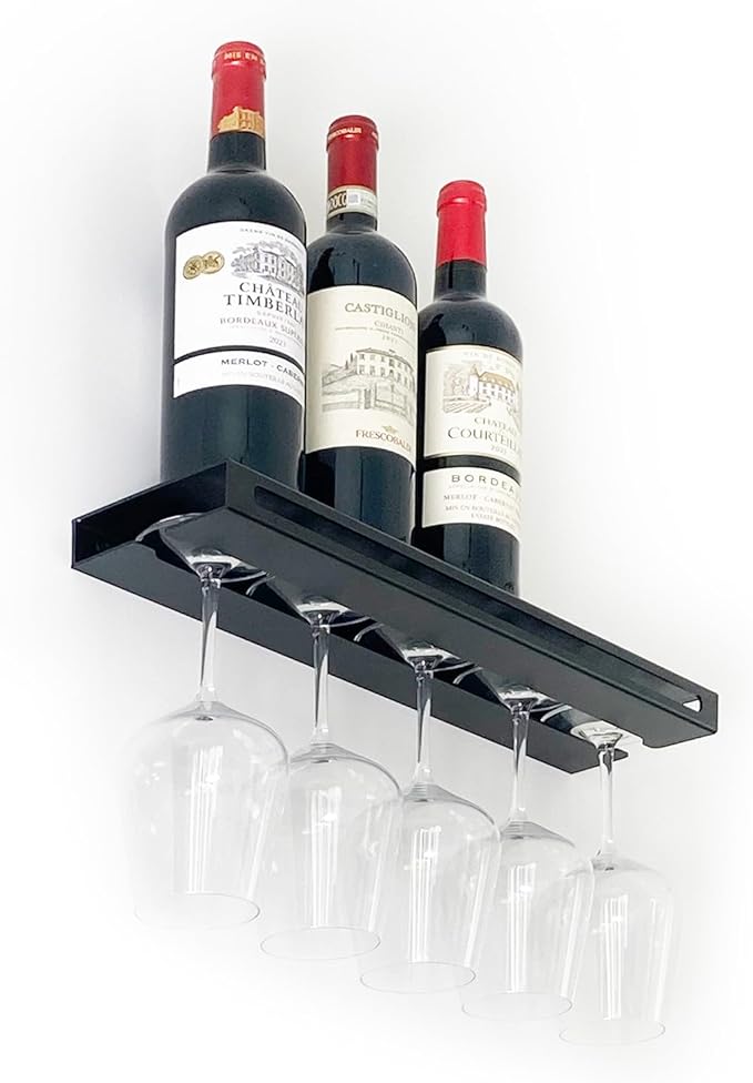 Wall Mounted Wine Rack – Metal Floating Bar Shelf with Bottle and Glass Holder, Holds 5 Bottles and 4-6 Glasses