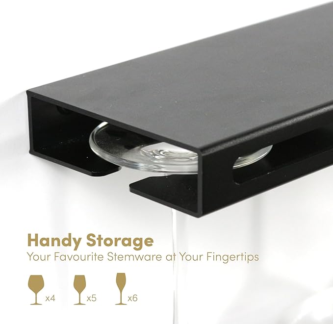 - Compact Yet Capacious: Measures 17.7” x 4.3” x 1.1”, stores up to five wine bottles, along with four large wine glasses