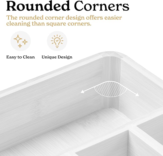 - A Purchase You'll Feel Great About - Made from sustainable bamboo, our bamboo drawer organizer is durable and easy to clean with rounded corners. This silverware holder is eco-friendly, user-friendly, and keeps your kitchen stylishly organized.