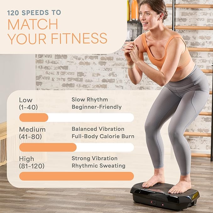 - Personalize Your Workouts - Get the exact workout you crave by using the remote on the vibrating platform exercise machine to choose between the 9 preset programs, manual mode, and 120 speed settings.