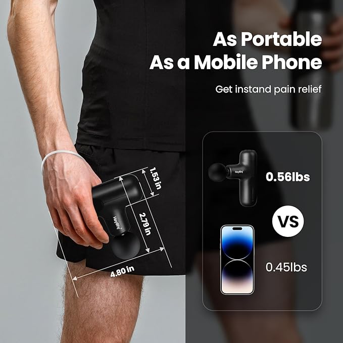 - 【Compact Size and Weight】Measuring only 4.8 x 2.8 x 1.5 inches and weighing just 0.56lbs, travel massage gun is highly portable and pocket-sized. Complete with a travel pouch, it becomes an essential companion for outdoor activities such as running, hiking, skiing, and cycling. Take it anywhere you go for instant relaxation and relief.